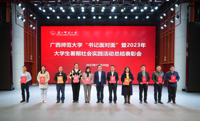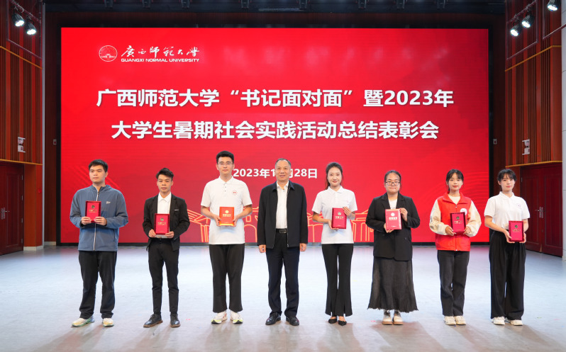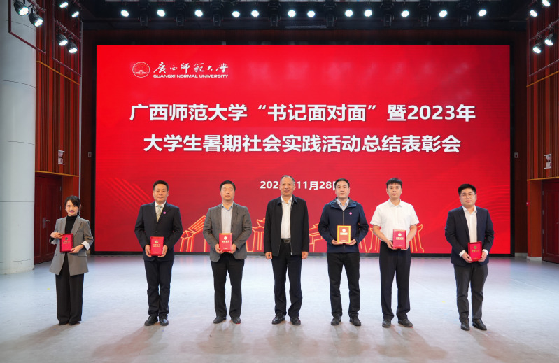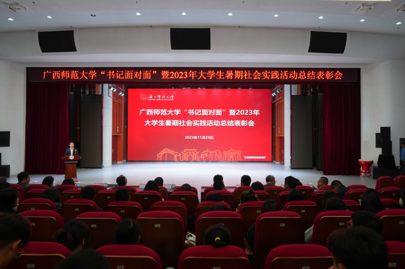 为深入学习贯彻习近平新时代中国特色社会主义思想,引导广大学生在社会实践中提高责任感和使命感,用脚步丈量祖国大地,在实践中“受教育、长才干、作贡献”,11月28日上午,我校在雁山校区音乐楼三楼综合厅举行“书记面对面”暨2023年大学生暑期社会实践活动总结表彰会。校党委书记贺祖斌,校党委副书记旷永青出席会议。会议由校团委主要负责人主持。