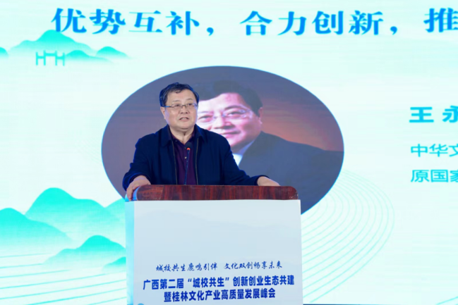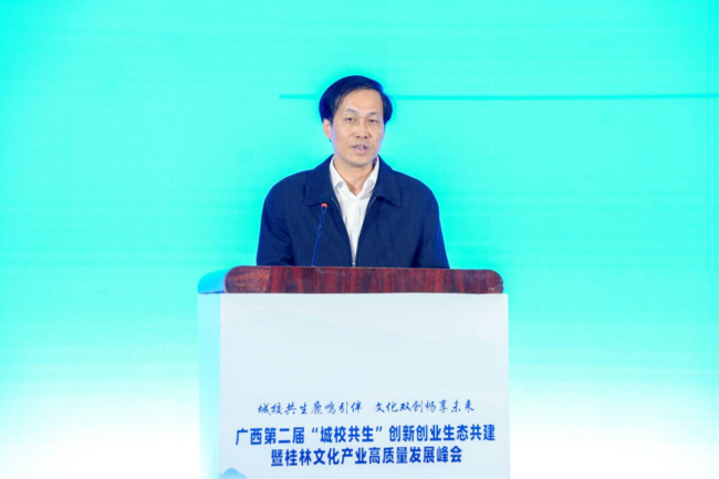 孙杰远校长在致辞中指出,共生是人类文明进步的核心标识,峰会选择这一主题,意义深远。他认为,城校共生是创新创业生态构建和文化产业高质量发展的必然选择。大学是城市的内涵,城市是大学的外延,双方相得益彰,共生共荣。大学创新创业生态和城市文化产业发展的城校共生共建是未来发展的必然选择。他强调,广西师范大学愿意为桂林市、为广西、为全中国的城校共生创新创业生态构建,特别为桂林市,乃至广西文化产业高质量发展提供可靠的、坚定的、专业的支持和平台。
