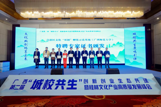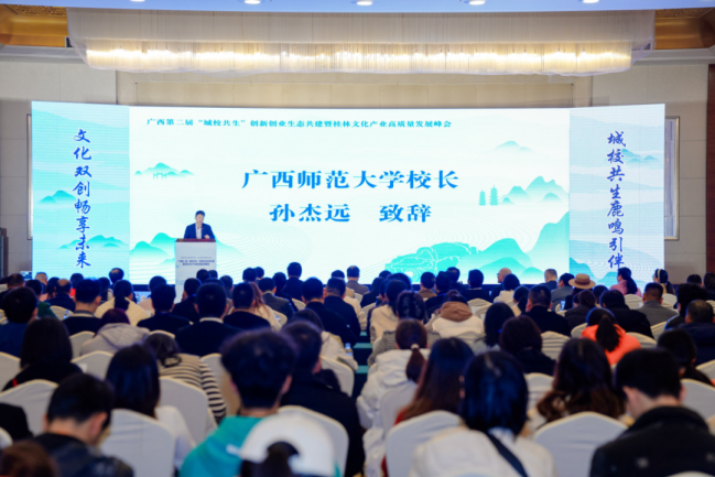 12月10日,以“城校共生鹿鸣引伴、文化双创畅享未来”为主题的广西第二届“城校共生”创新创业生态共建暨桂林文化产业高质量发展峰会于桂林市桂山华星酒店成功举行。本次峰会由广西师范大学、中共桂林市委员会宣传部联合主办。国内外双创及文化产业的专家学者、桂林市各县(市、区)委员会宣传部代表、桂林市文化企业代表、广西高校创新创业学院代表、广西师范大学师生代表等,近500人参会。