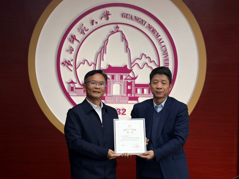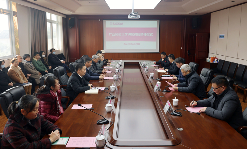 为推进全国重点马院高质量发展,12月20日下午,我校举行广西师范大学讲席教授聘任仪式,我校校长孙杰远代表学校向林春逸教授颁发讲席教授聘书,聘任仪式由我校党委常委、副校长汤志华主持。