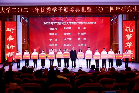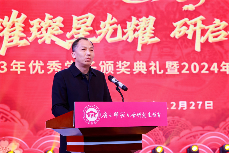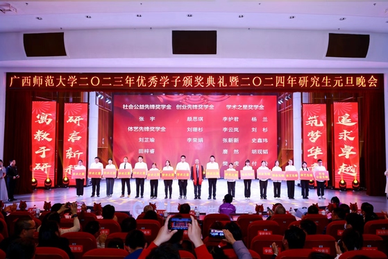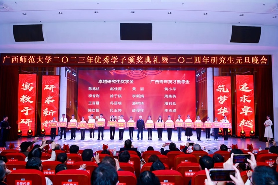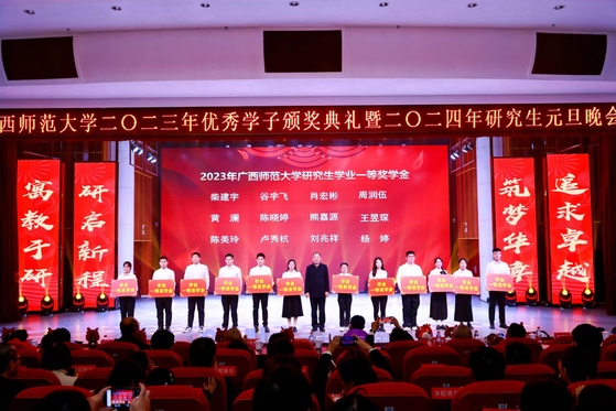 12月27日晚,广西师范大学“璀璨星光耀,研启新时代”2023年优秀学子颁奖典礼暨2024年研究生元旦晚会在雁山校区音乐学院三楼综合厅举行。校党委副书记旷永青、副校长李先贤出席晚会。党委研究生工作部、研究生院、物理学院党委负责人以及部分职能部门和培养单位的领导老师、兄弟高校研究生会代表莅临晚会现场,与来自全校21个研究生培养单位的同学们共同观看演出。