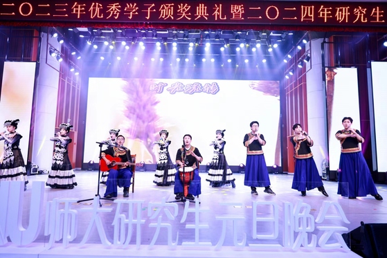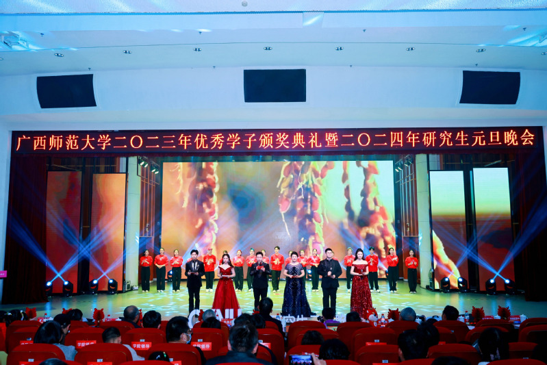 本场晚会由研究生自主设计、编排,充分展现出广西师范大学研究生多才多艺、全面发展的风采,体现了学校多元人才培养的成果。最后在校研究生艺术团的同学们热情的歌舞《新年快乐》中,2023年优秀学子颁奖典礼暨2024年研究生元旦晚会圆满落下帷幕。