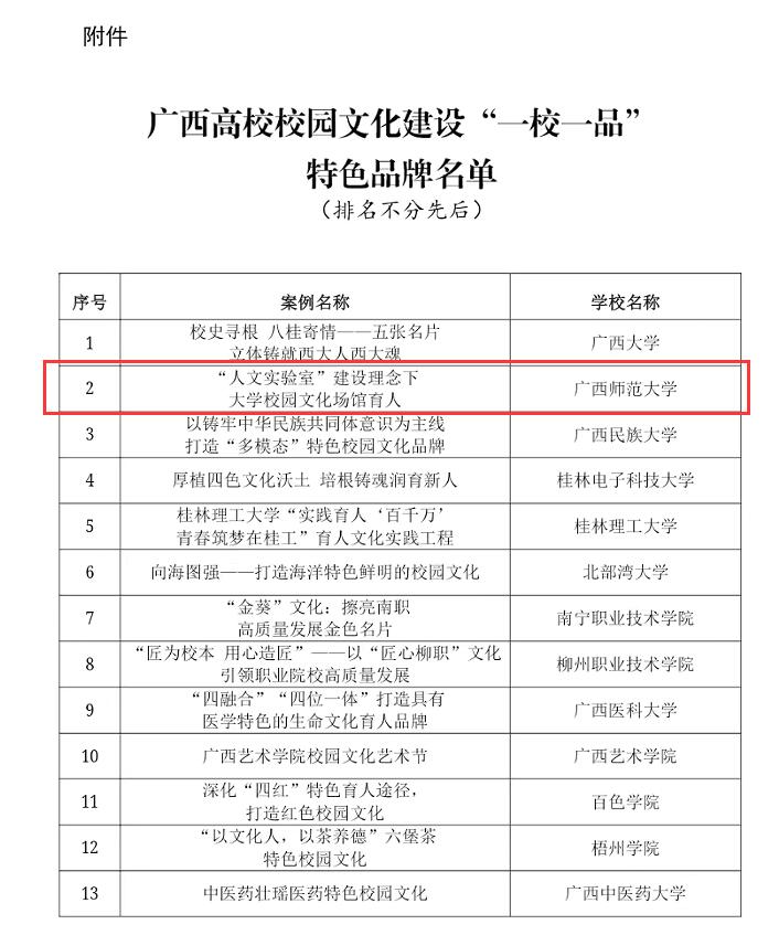 近日,自治区党委教育工委下发了关于公布广西高校校园文化建设“一校一品”特色品牌的通知,我校“人文实验室”建设理念下大学校园文化场馆育人成功入选。