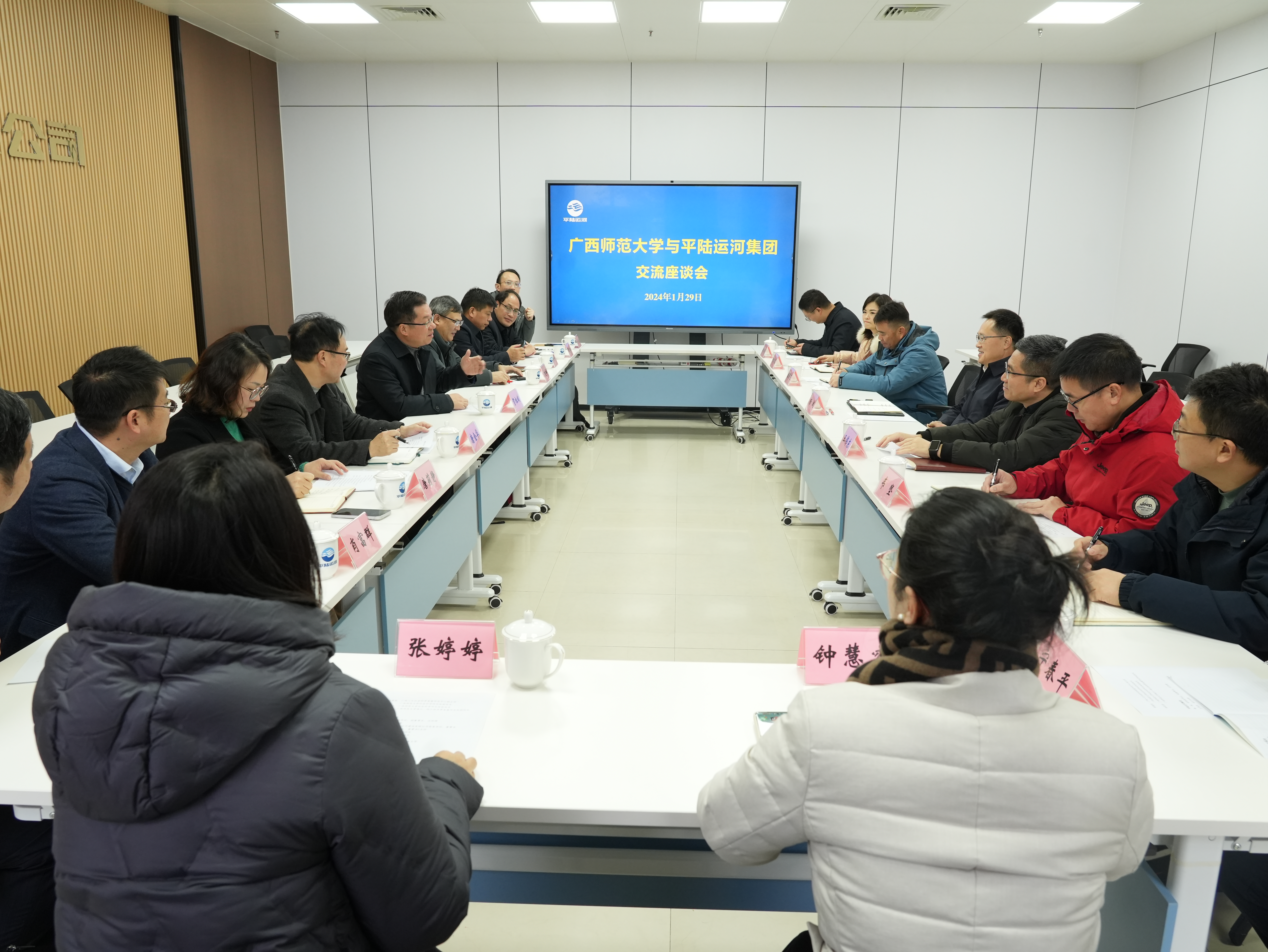 平陆运河集团有限公司办公室、党群人事部、工程管理部、投资发展部、科技信息部相关负责人,学校党委办公室、党委组织部、社会科学研究处/广西人文社会科学发展研究中心、历史文化与旅游学院、经济管理学院、化学与药学学院、生命科学学院相关负责人,桂林发展研究院、西部乡村振兴研究院、珠江—西江经济带发展研究院、广西漓江流域景观资源保育与可持续利用重点实验室、广西低碳能源材料重点实验室、广西新能源船舶电池工程技术研究中心、广西电化学能源材料与器件科技成果转化中试研究基地、广西高校数字赋能经济发展重点实验室、广西数字经济研究院等智库专家代表参加座谈交流。