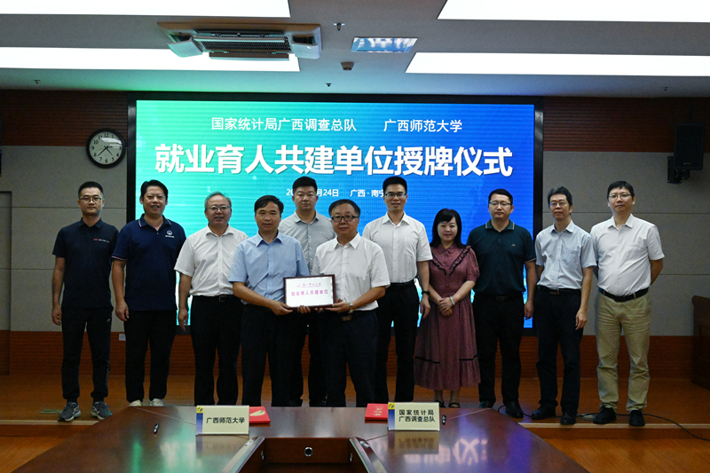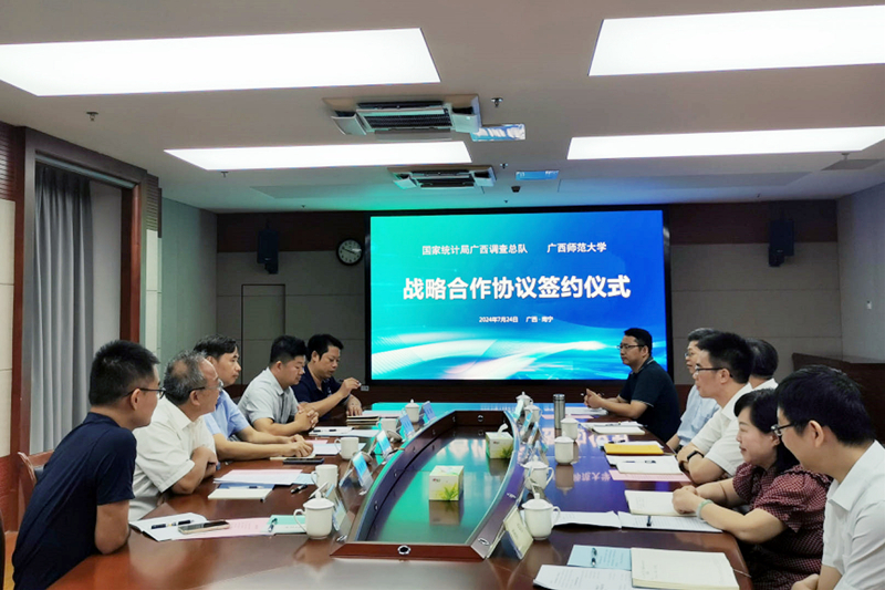 近日,我校与国家统计局广西调查总队在南宁签订战略合作协议。校党委常委、副校长黄文韬,国家统计局广西调查总队党组成员、副总队长李青出席签约仪式并代表双方签署协议。广西应用数学中心(广西师范大学)负责人、数学与统计学院领导代表、广西调查总队相关处事人员参加活动。