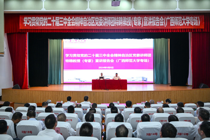 9月9日下午,学习贯彻党的二十届三中全会精神自治区党委讲师团特聘教授(专家)宣讲报告会在我校育才校区田家炳教育书院一楼报告厅举行。自治区党委党史研究室副主任黄志勇研究员作宣讲报告。校党委书记贺祖斌主持报告会。
