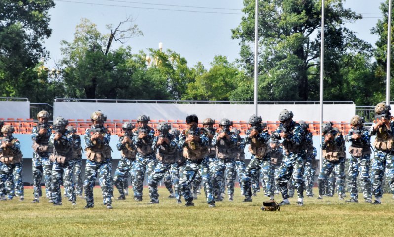 汇报展演现场,国旗护卫队身姿挺拔、宛如松柏,持枪方阵姿态威武、步伐稳健,战术演练硝烟弥漫、战鼓雷动,男子擒拿拳表演拳风凌厉、气势磅礴,女子匕首操敏捷灵动、尽显英姿,充分展现师大学子奋发向上的精神面貌、军训磨砺下的青春风采。