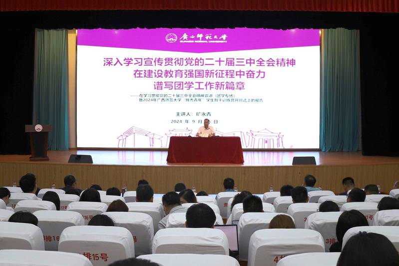 旷永青以《深入学习宣传贯彻党的二十届三中全会精神,在建设教育强国新征程中奋力谱写团学工作新篇章》为题,围绕“深刻领悟党的二十届三中全会的重大意义”“深入学习领会习近平总书记在党的二十届三中全会上的重要讲话精神”“全面准确理解《中共中央关于进一步全面深化改革、推进中国式现代化的决定》重大部署,重点把握教育改革发展方向”等方面进行了深入宣讲。