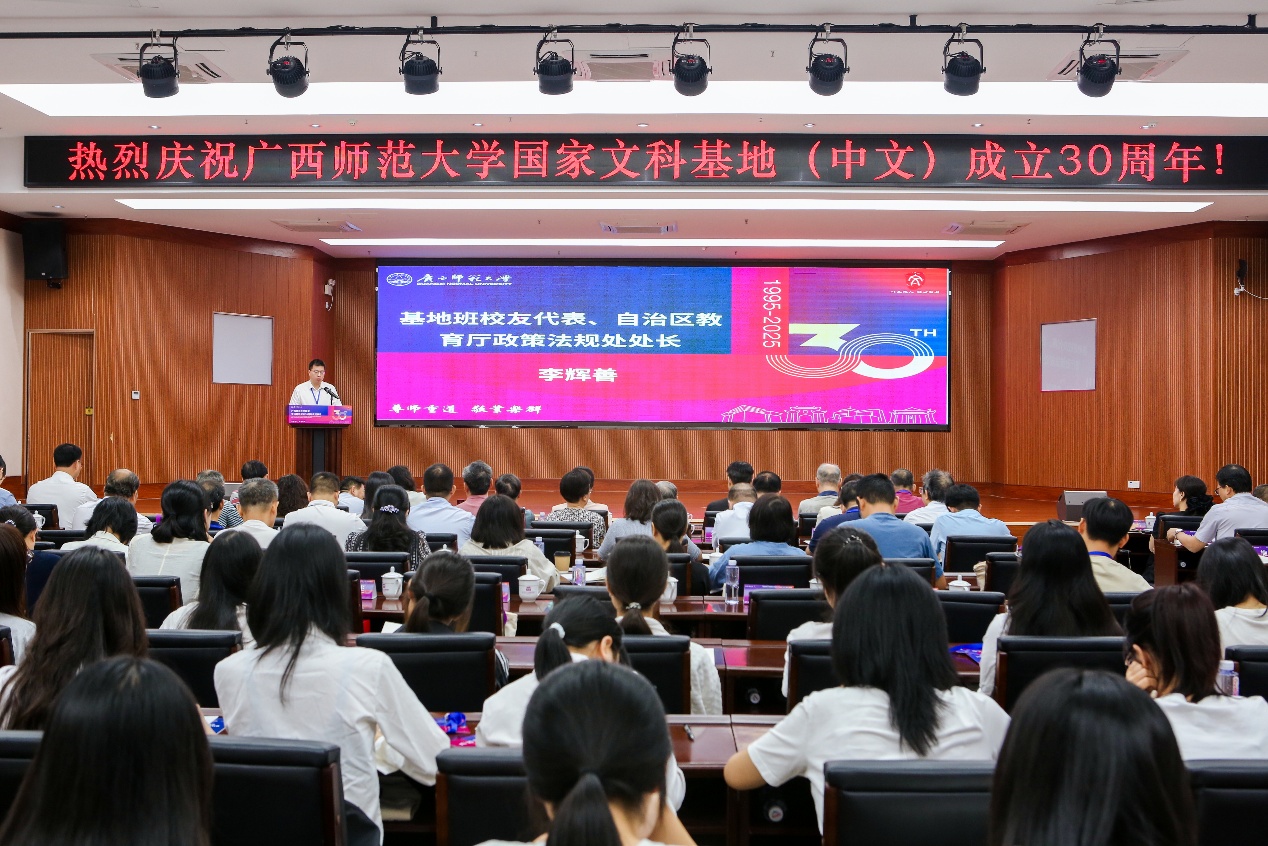 基地班校友代表李辉善作了题为《回到精神的故乡》的演讲,深情回顾在广西师范大学文学院基地楼求学的岁月,分享文科基地带给师生的精神底气和文化基因。