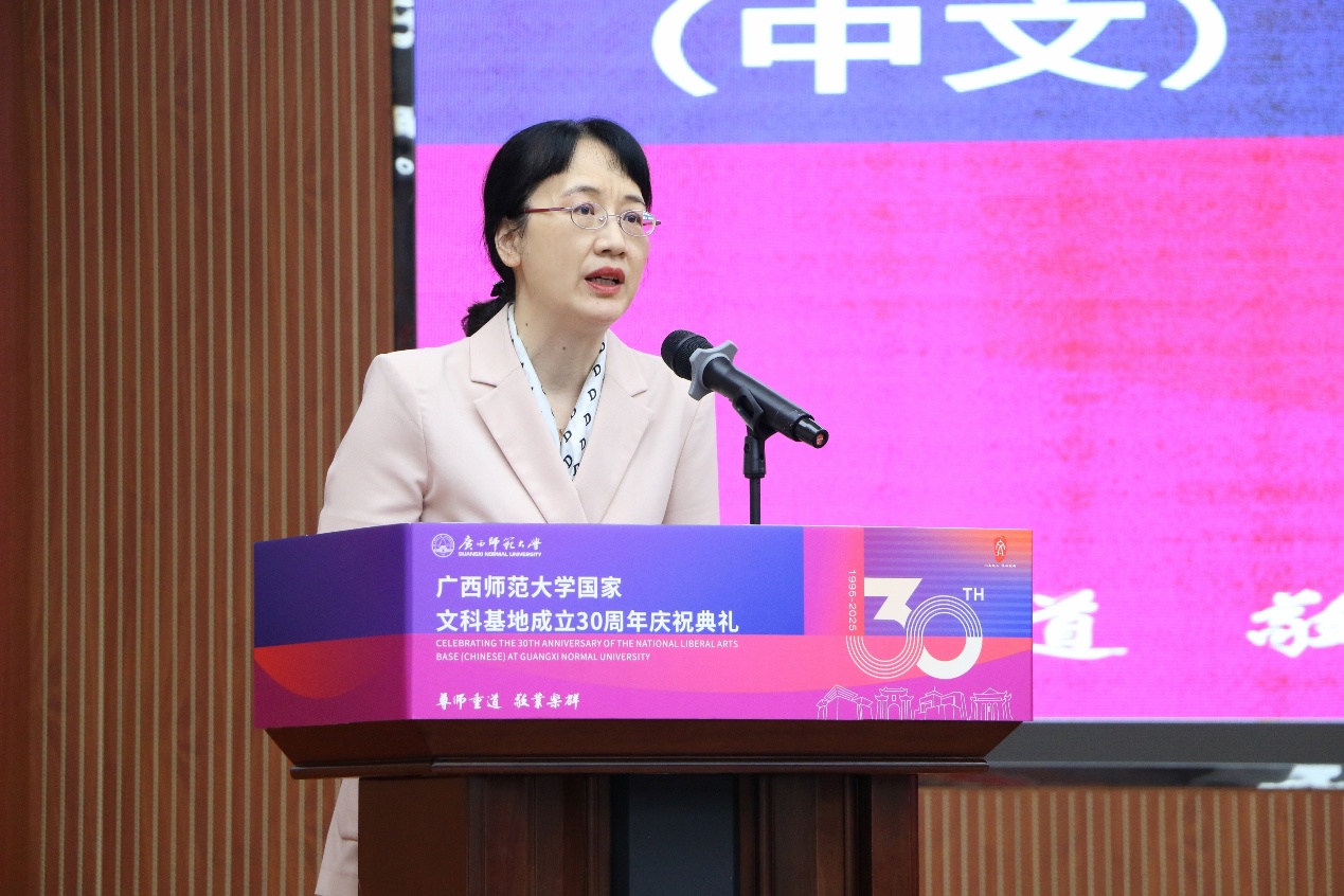 冯智明从文科基地概况、发展分期、突出成就三个方面介绍基地三十年的发展历程及成就。她表示,历经三十年的风雨洗礼与不懈奋斗,基地已建设成在国内外具有重要影响力的文科人才培养与科研创新高地,为广西师范大学的学科攀登做出了重要贡献。基地将接续“立德树人、追求卓越”的精神火炬,以更加昂扬的姿态、更加务实的行动,再铸新时代文科高地。