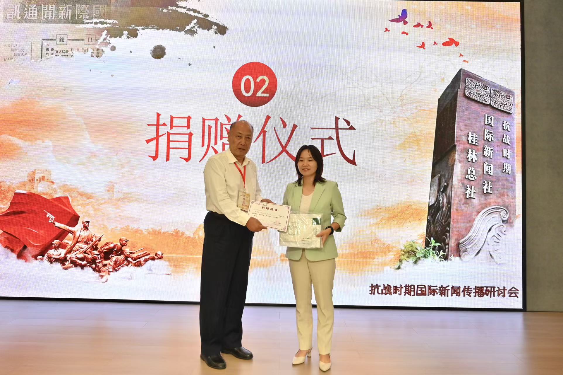 本次研讨会议程丰富、内容充实。主旨发言环节聚焦抗战时期新闻史、国际新闻传播、文学和新闻融合传播等方面。南京师范大学靖鸣教授、中国绿色时报广西记者站张雷站长,以及我校的唐凌、刘铁群、王艳萍等专家分享了深刻的学术思考。圆桌论坛环节关注当下实践。两组专家围绕“如何加强桂林抗战文化研究”“抗战文化赋能桂林旅游”进行了思想碰撞。会上,中国著名战地记者、原国新社香港分社社长陆诒之子陆良年向中新社和广西师范大学捐赠其父所留手稿及照片等物品。原广西师专军训大队长、原广西省人民法院首任院长杨徳华之子杨小川向广西师范大学捐赠其父亲的工作手稿和物品。