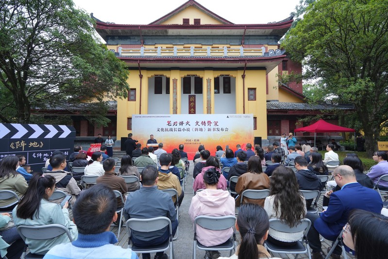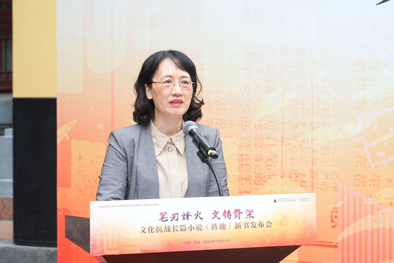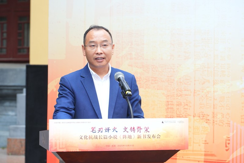 陈伦元在致辞中指出,小说《阵地》以深厚的历史底蕴和精湛的艺术笔触,生动再现80年前中国文化界人士和桂林民众为抗击日本侵略所经历的同仇敌忾岁月,深刻揭示“文化抗战”这一特殊战场的伟大意义。历史回响,总是与时代呼唤相交织。站在新的历史起点上,重温桂林作为抗战文化阵地的峥嵘岁月,不仅仅是缅怀先烈,更是为了汲取穿越时空的精神力量,弘扬在困境中开拓、在压力下坚守、在融合中创新的时代精神。