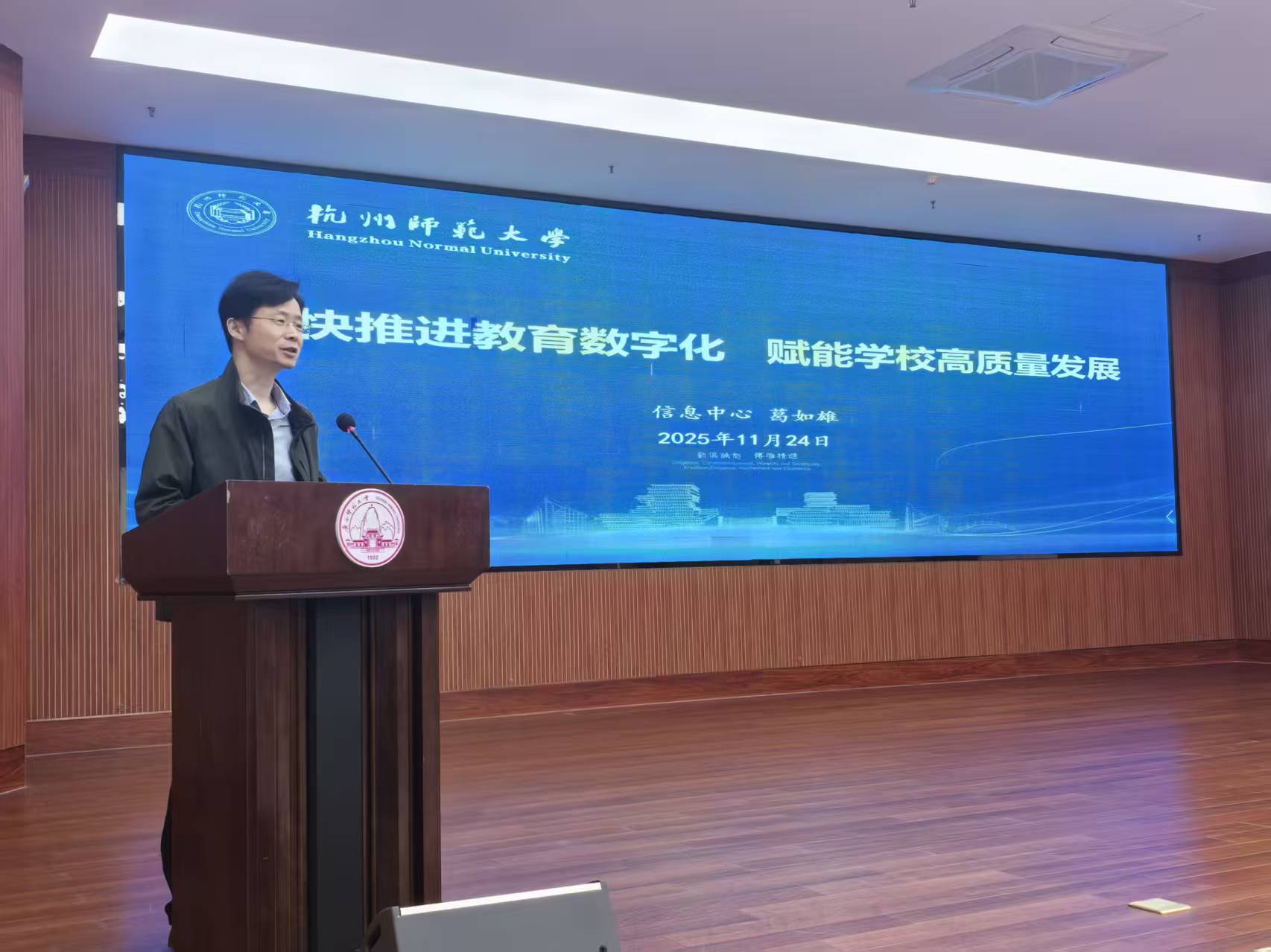会议邀请杭州师范大学信息中心主任葛如雄分享了杭州师范大学在智慧校园顶层规划、数据治理体系架构、校务服务数智融合、项目建设经验及AI创新实践等方面的探索。网络信息中心主要负责人汇报了学校“十四五”信息化与智慧校园建设简况,以及“十五五”信息化与智慧校园建设专项规划(征求意见稿)情况。