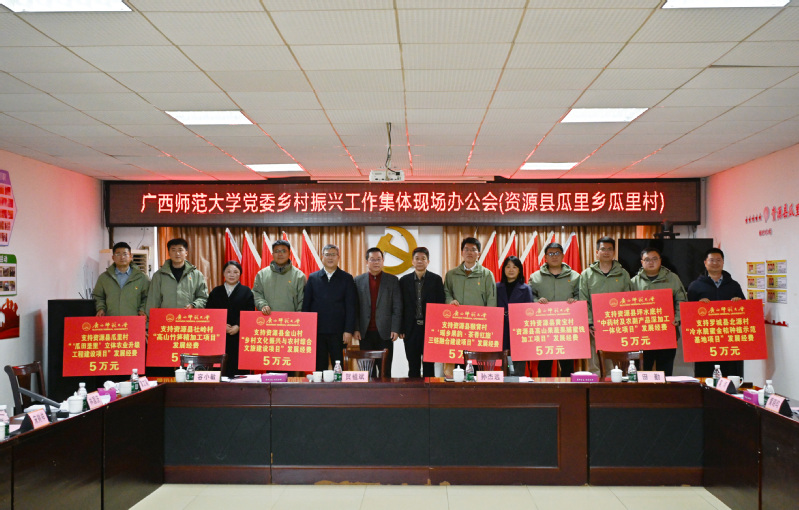 12月23日,广西师范大学党委 2025 年对口资源县帮扶村乡村振兴集体现场办公会在资源县瓜里乡政府四楼会议室召开。学校党委书记、乡村振兴工作领导小组组长贺祖斌,党委副书记、校长、乡村振兴工作领导小组组长孙杰远,校领导黄文韬、莫坷、林国庆、黄晓昀、宋树祥,校党委常委谭智雄、毛立刚出席会议。资源县政协主席容小敏,县委副书记田勤,挂职县委常委、副县长、驻村工作队队长贾越峰,瓜里乡党委书记汪明,以及资源县县直相关单位主要负责人,学校乡村振兴工作领导小组成员单位负责人,学校派驻资源县工作队长、对口帮扶村第一书记(工作队员)等参加会议。