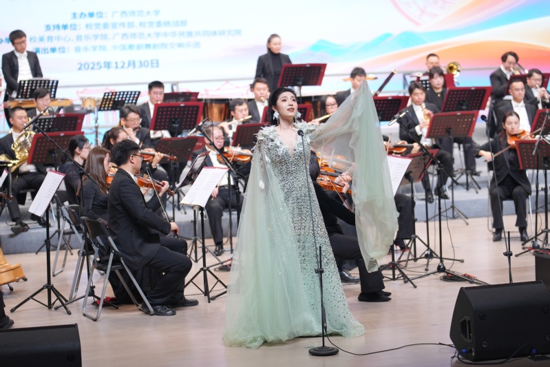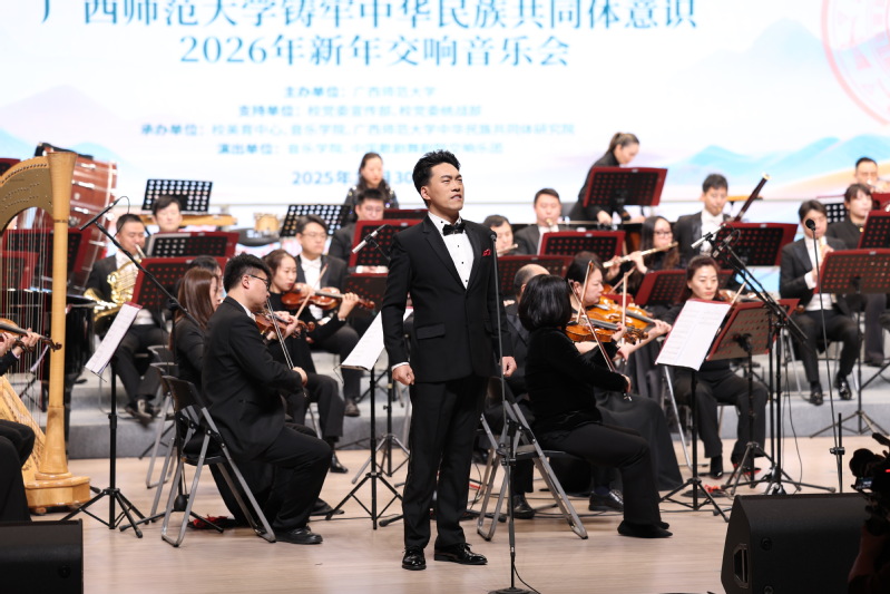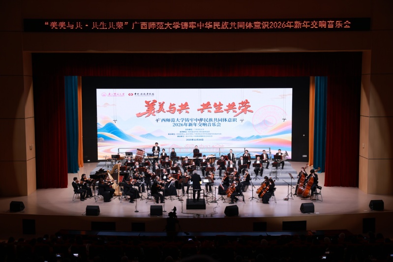 为深入落实教育强国和文化强国战略,12月30日晚,广西师范大学“美美与共·共生共荣”铸牢中华民族共同体意识2026年新年交响音乐会在雁山校区大学生创新创业中心演艺厅举行。活动以铸牢中华民族共同体意识为主线,旨在通过交响乐这一世界性艺术语言,生动展现中华民族多元一体的文化格局,传递“各民族像石榴籽一样紧紧抱在一起”的时代强音。