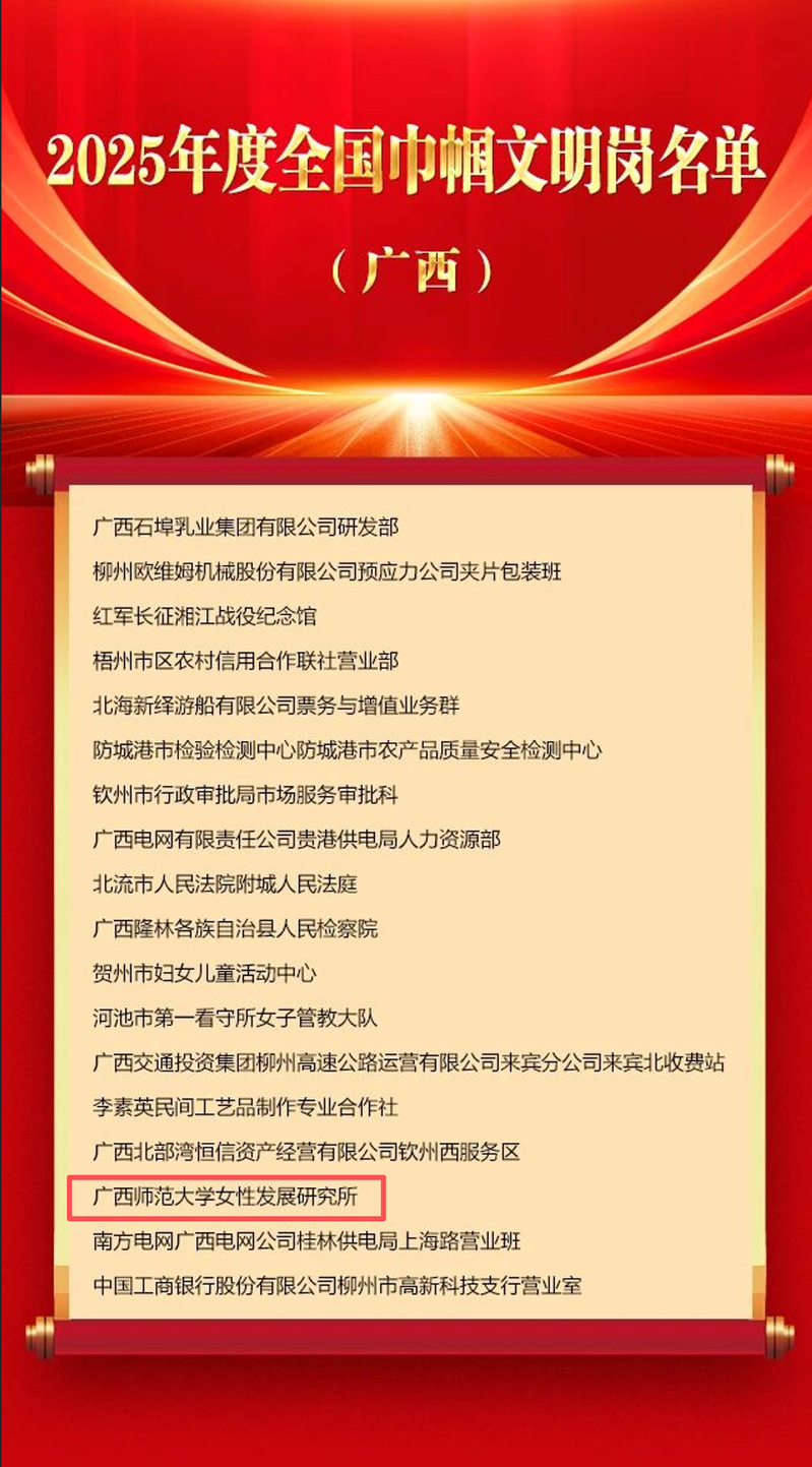 近日,全国妇联公布了2025年度全国三八红旗手标兵、全国三八红旗手、全国三八红旗集体、全国巾帼文明岗名单,我校女性发展研究所荣获“全国巾帼文明岗”荣誉称号。