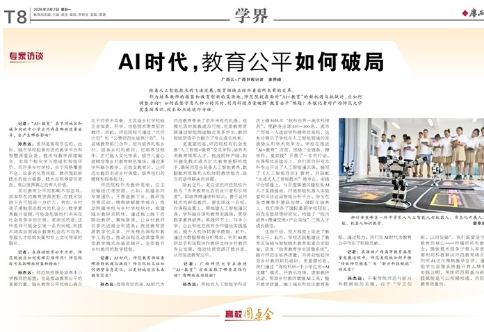 随着人工智能技术的飞速发展,人工智能正深刻重塑教育生态,但也可能加剧城乡之间的数字鸿沟。面对“AI+教育”带来的机遇与挑战,师范院校应如何担当?2月1日,【广西日报】记者专访我校党委副书记、校长孙杰远,探讨师范院校如何借力AI实现自我革新,促进教育公平。