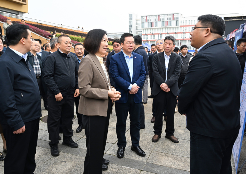 自治区党委常委、自治区副主席卢新宁(左二)带队到校调研指导,与用人单位现场交流,校党委书记贺祖斌(右二)、校长孙杰远(右一)陪同。