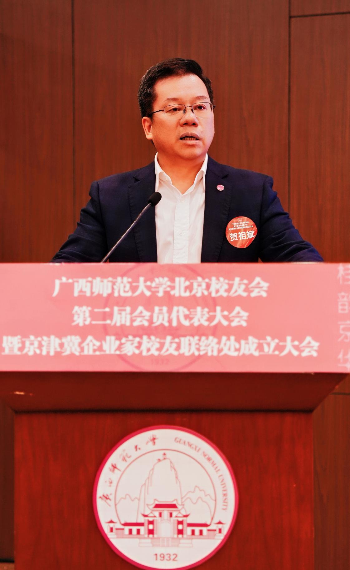 贺祖斌代表学校,对大会的召开以及新当选的北京校友会第二届理事会、监事会成员表示热烈祝贺。他指出,北京校友会自成立以来,始终秉持“尊师重道 敬业乐群”的校训精神,广泛凝聚团结广大校友,在联络校友感情、服务母校建设发展等方面开展了大量卓有成效的工作,取得了亮眼成绩。京津冀企业家校友联络处的成立,既是学校校友工作战略布局的关键一步,也是学校主动融入京津冀协同发展国家战略、服务区域经济社会发展的重要举措。他希望新一届北京校友会理事会坚持传承创新、接续奋斗,着力打造更有温度、更具活力的北京“校友之家”;希望京津冀企业家校友联络处充分发挥平台枢纽作用,推动校友企业资源共享、项目对接、合作共赢,积极促进母校与京津冀地区在科研成果转化、人才培养、实习就业等领域的深度合作,携手构建母校与校友“同心同向同行,共建共享共赢”的高质量发展共同体。